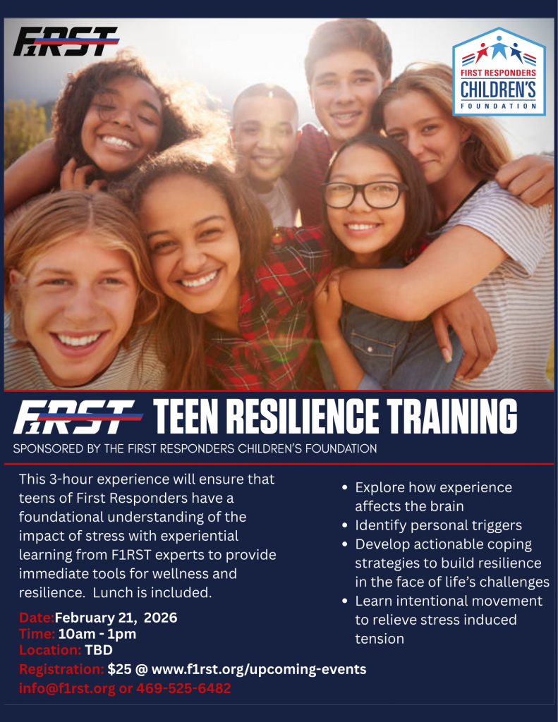 This 3-hour experience will ensure that teens of First Responders have a foundational understanding of the impact of stress with experiential learning from F1RST experts to provide immediate tools for wellness and resilience. Lunch is included.